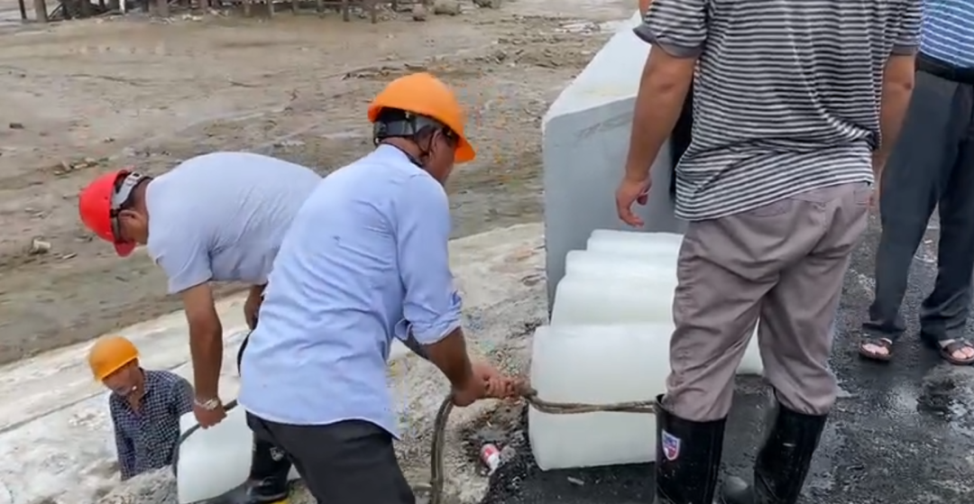 这一次,救援人员不再急于“遣送”海豚回家,而是在专业人员的指导下,在海豚搁浅处搭起临时帐篷,一边用冰块为其降温,一边对海豚身上的伤口进行消毒处理。
