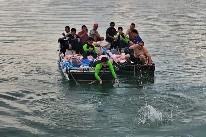 为了避免对海豚造成碰撞等二次伤害,救援人员用木排作“担架”,在上面铺上棉被,小心翼翼地将海豚抬了上去。