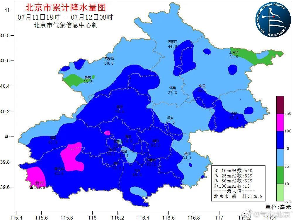 截至12日07时,全市平均降雨量50.7毫米,城区平均58.5毫米,东南部42.7毫米,西南部62.4毫米,东北部41.7毫米,西北部48.5毫米。全市各区均出现超过50毫米的暴雨,房山局地大暴雨(最大房山新村116.4毫米),最大雨强48.7毫米(门头沟东山村19时30分-20时)。房山、门头沟、昌平、海淀、石景山、延庆、怀柔出现6级以上大风,阵风9级左右。