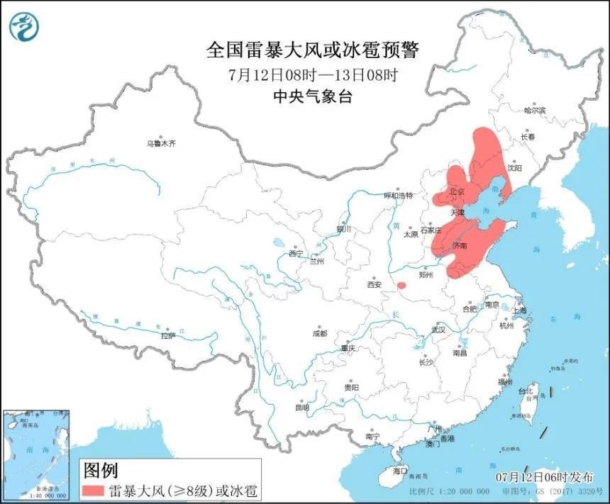 预计7月12日08时至13日08时,内蒙古中东部、黑龙江西部、辽宁南部和西部、河北、北京、天津、山东、河南南部和西部、安徽北部、江苏北部、湖北南部、湖南北部、四川南部、重庆中西部、贵州北部、云南西南部、广西东南部沿海等地的部分地区将有短时强降水天气,小时雨量30-60毫米,局地可达80毫米以上;内蒙古东南部、辽宁中西部和南部、河北北部、北京、天津、山东、河南北部和东部、江苏北部等地的部分地区将有8-10级雷暴大风或冰雹天气, 局地风力可达11级以上。