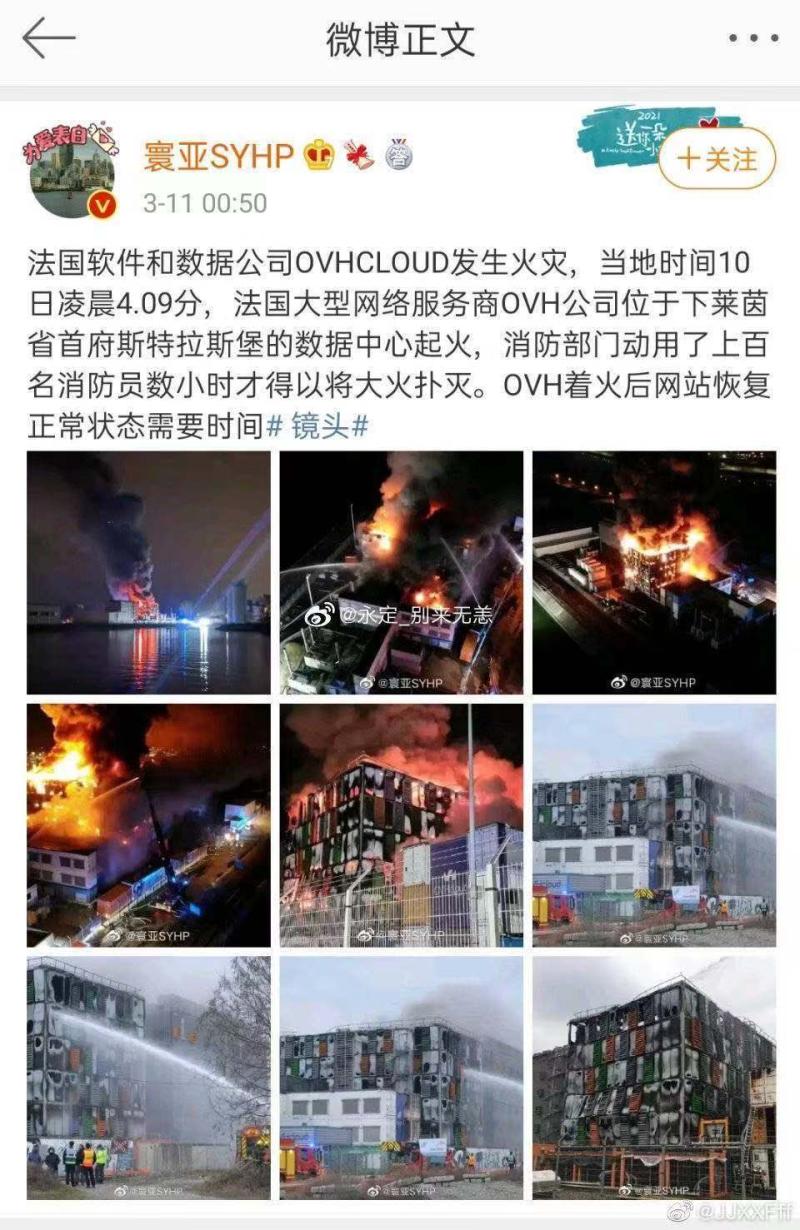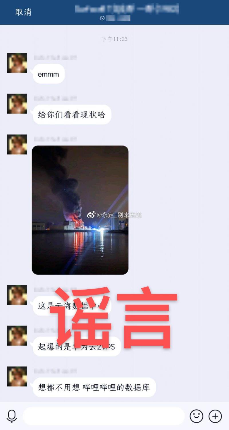 而关于“上海云海服务器管理中心着火”这一说法,则出自一名网友上传的微信群聊天截图,里面配有一张建筑物起火的照片。记者注意到,这张照片已被网友证实系今年3月份法国一家数据公司发生火灾时的场景。