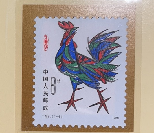 鸡票(80版第二枚)。图案的是一只形象传神的斑斓雄鸡,鸡冠红似鲜花,朝气蓬勃,正如中华民族复兴的伟大进程,势不可挡。