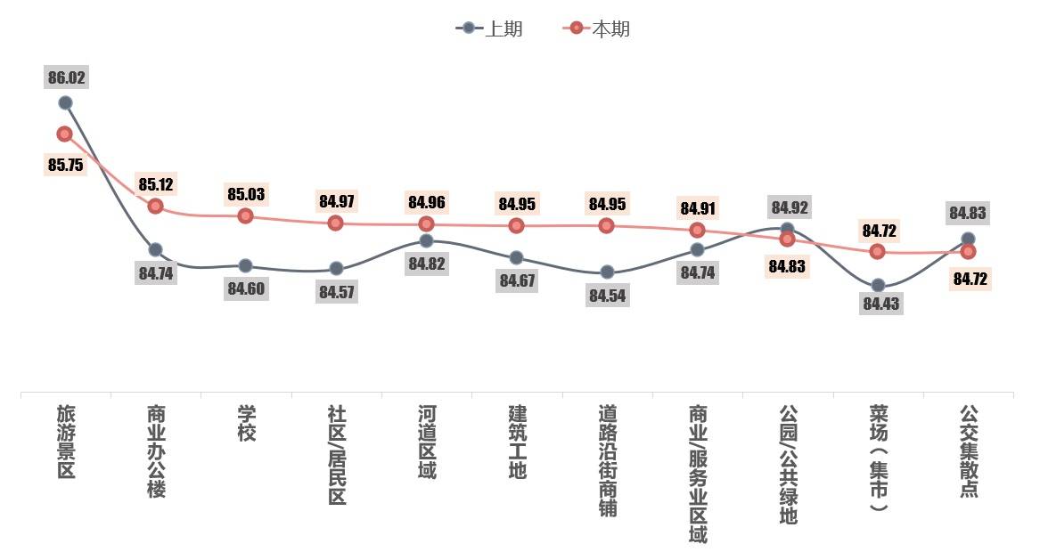 测评结果显示,11类受访地点中受访对象对“旅游景区”、“商业办公楼”和“学校“的满意度较高,均达到优良等级;而”菜场(集市)“和”公交集散点“附近的受访对象满意度相对较低。另一方面,与2020下半年比较,“旅游景区”、“公园/公共绿地”和“公交集散点”附近的满意度小幅下降,而其他受访地点的满意度均有所上升。