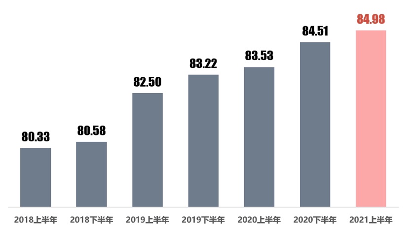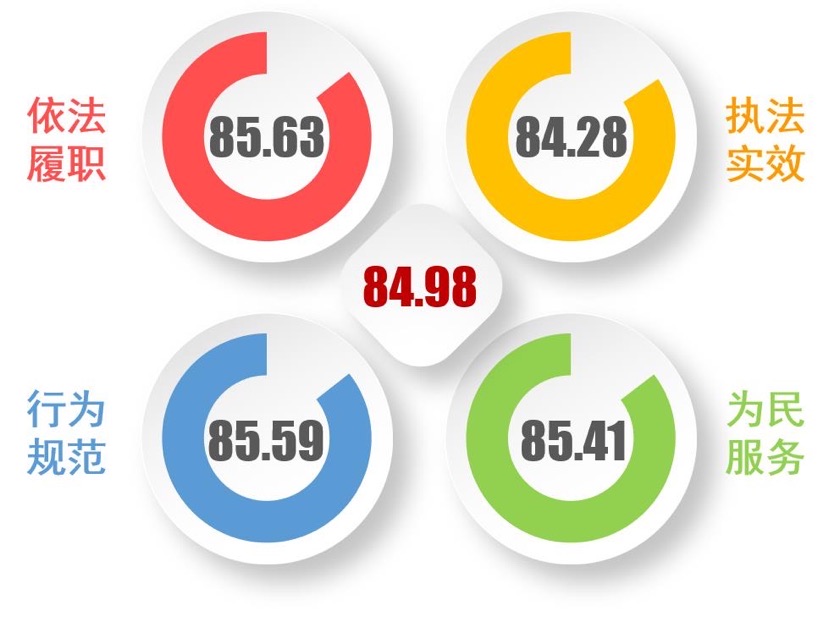 经测评,2021上半年全市城管执法工作社会满意度综合评分为84.98分,相比2020下半年提高了0.47分。对照“较差、一般、尚可、良好、优良、优秀”六个等级,从2018上半年起连续七期达到“良好”等级。