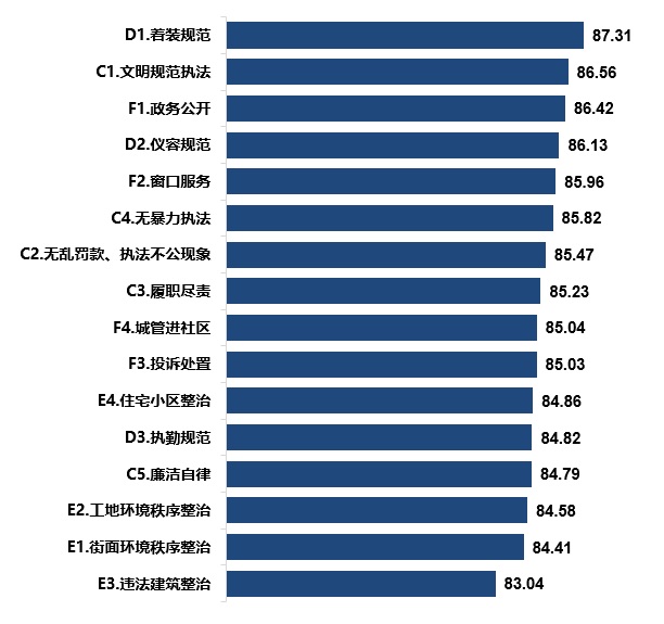 测评结果显示,本期四大指标分值均超过80分。其中,“依法履职”和“行为规范”两项指标得分较高。而“执法实效”仍相对得分较低。二级指标方面,“着装规范”、“文明规范执法”和“政务公开”测评得分较高。