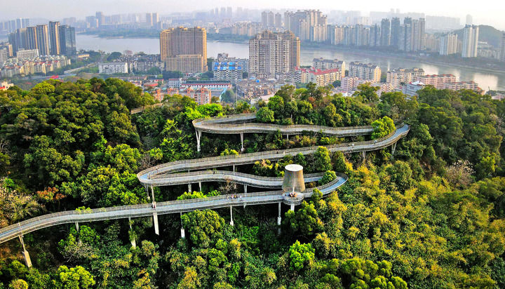 ↑3月16日,在福州金牛山公园福道拍摄的森林城市景观(无人机照片)。