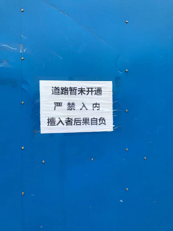 新民晚报记者首先来到居民们还可“勉强通行”的小区南门。这个进出口处的横向马路是一条无名“断头路”,东侧封闭,只有西侧可以通行。东面一侧被施工方拦了起来,从缝隙里看过去,路面坑洼,并未全部竣工。不过,施工方张贴的告示上却写着:2020年12月3日竣工。