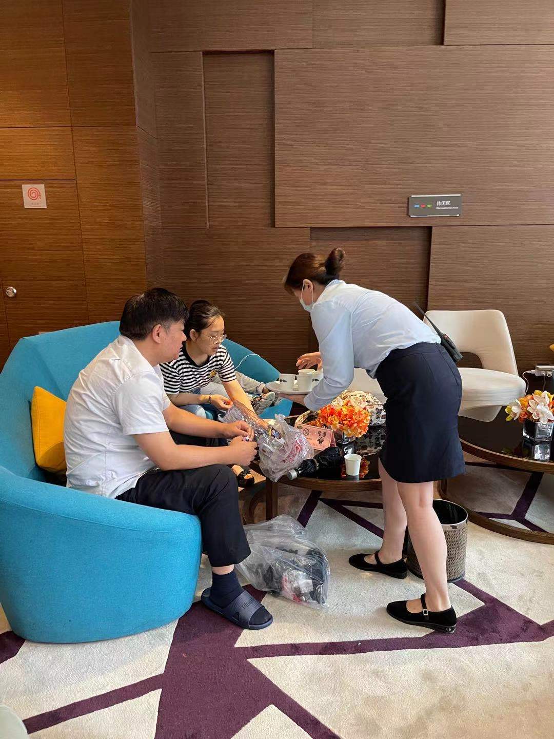 锦江酒店(中国区)旗下某酒店员工为滞留旅客提供免费茶水。