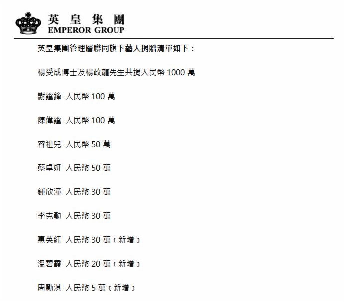 英皇集团公布的捐款名单包括:杨受成及杨政龙(1000万)、谢霆锋(100万)、陈伟霆(100万)、容祖儿(50万)、蔡卓妍(50万)、钟欣潼(30万)、李克勤(30万)、惠英红(30万)、温碧霞(20万)、周励淇(5万)。