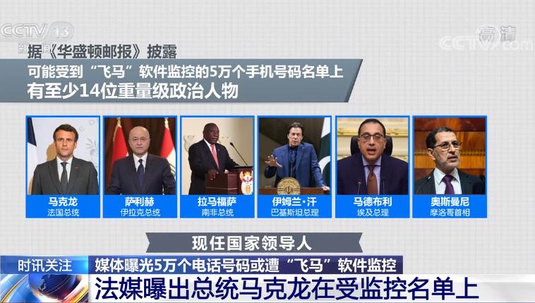 据《华盛顿邮报》披露,在可能受到“飞马”软件监控的5万个手机号码名单上,有至少14位重量级政治人物。这14人包括6位现任国家领导人,除马克龙外,还有伊拉克总统萨利赫、南非总统拉马福萨、巴基斯坦总理伊姆兰·汗、埃及总理马德布利和摩洛哥首相奥斯曼尼。此外,还有7位前总理或前首相,在任时也曾遭到监控,包括法国前总理爱德华·菲利普,以及比利时前首相米歇尔等人。此外,摩洛哥国王穆罕默德六世也在名单上。