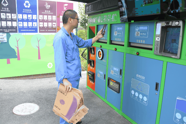 如何使用智能柜式垃圾箱?首先扫码、然后选择投放种类,待开门指示灯亮起,投放物品、智能化称重、获得积分,累积满100积分即可在微信上兑换零钱1元。