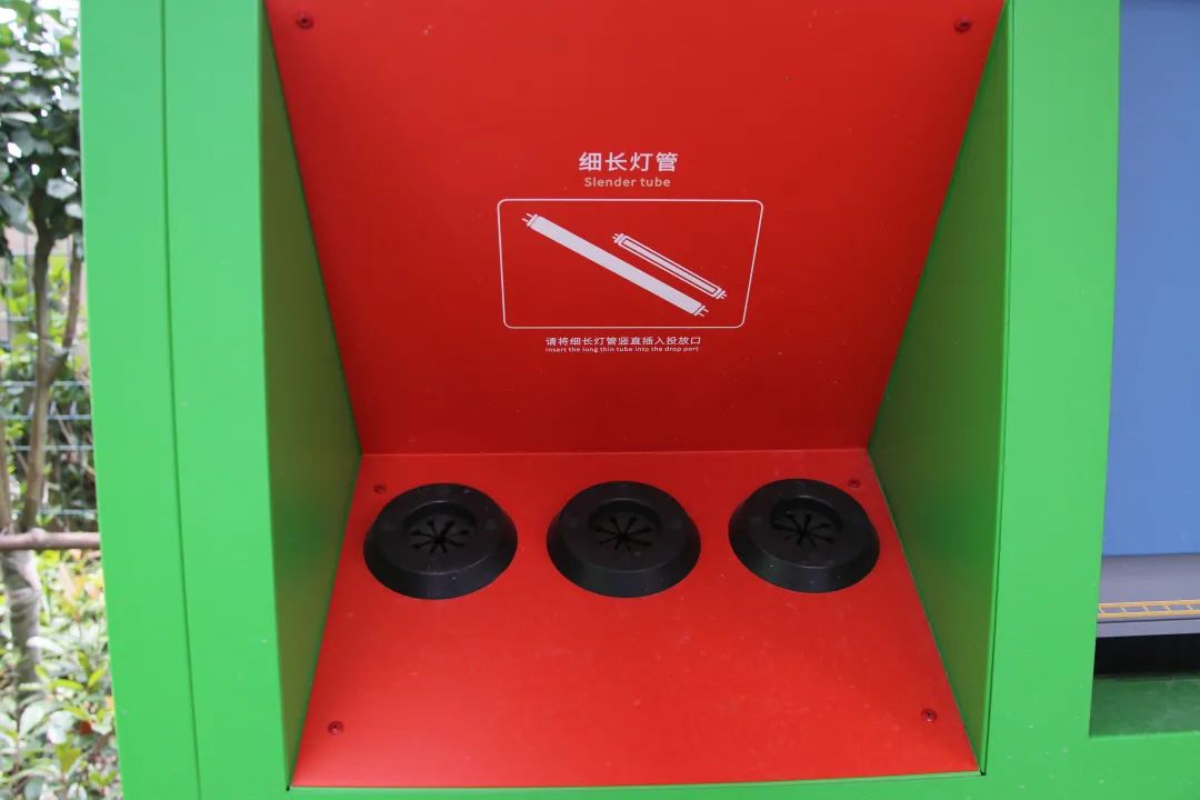 投口照明。投口上方设计投递照明灯,投递垃圾时,用户能更清晰地看到垃圾投口,将垃圾准确投入内桶;同时产品整体设计防水结构,产品电器件安装处设有密封胶条,防水效果更好、寿命更长,可在户外使用;设备配置遮阳棚,顶部巧妙设计防积水斜顶,有效防止顶部积水或积雪等。