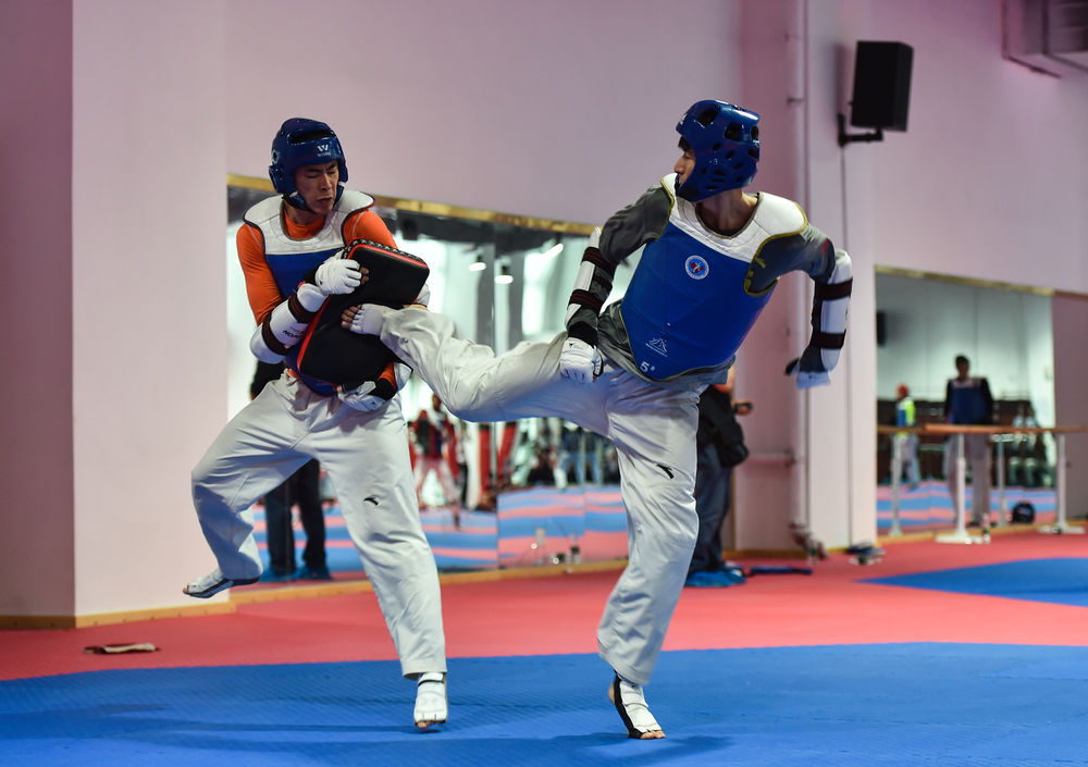 资料图:国家跆拳道队运动员赵帅(右)在训练中。新华社发(柴婷摄)