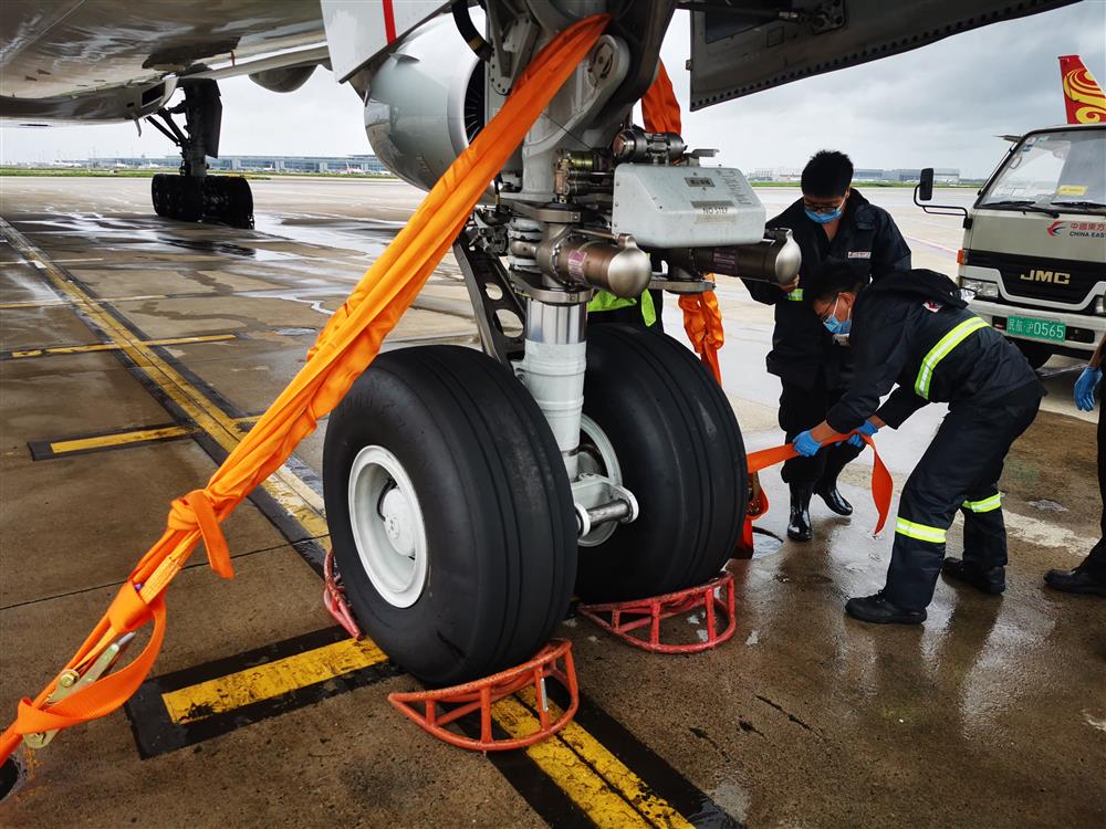24日下午至夜间,上海两大机场的停机坪上,航司工作人员争分夺秒系留飞机。系留飞机即使用绑带、吊扣、绳环在飞机的主起落架和前起落架将飞机系留在地锚,防止飞机被大风吹动发生碰撞事故。