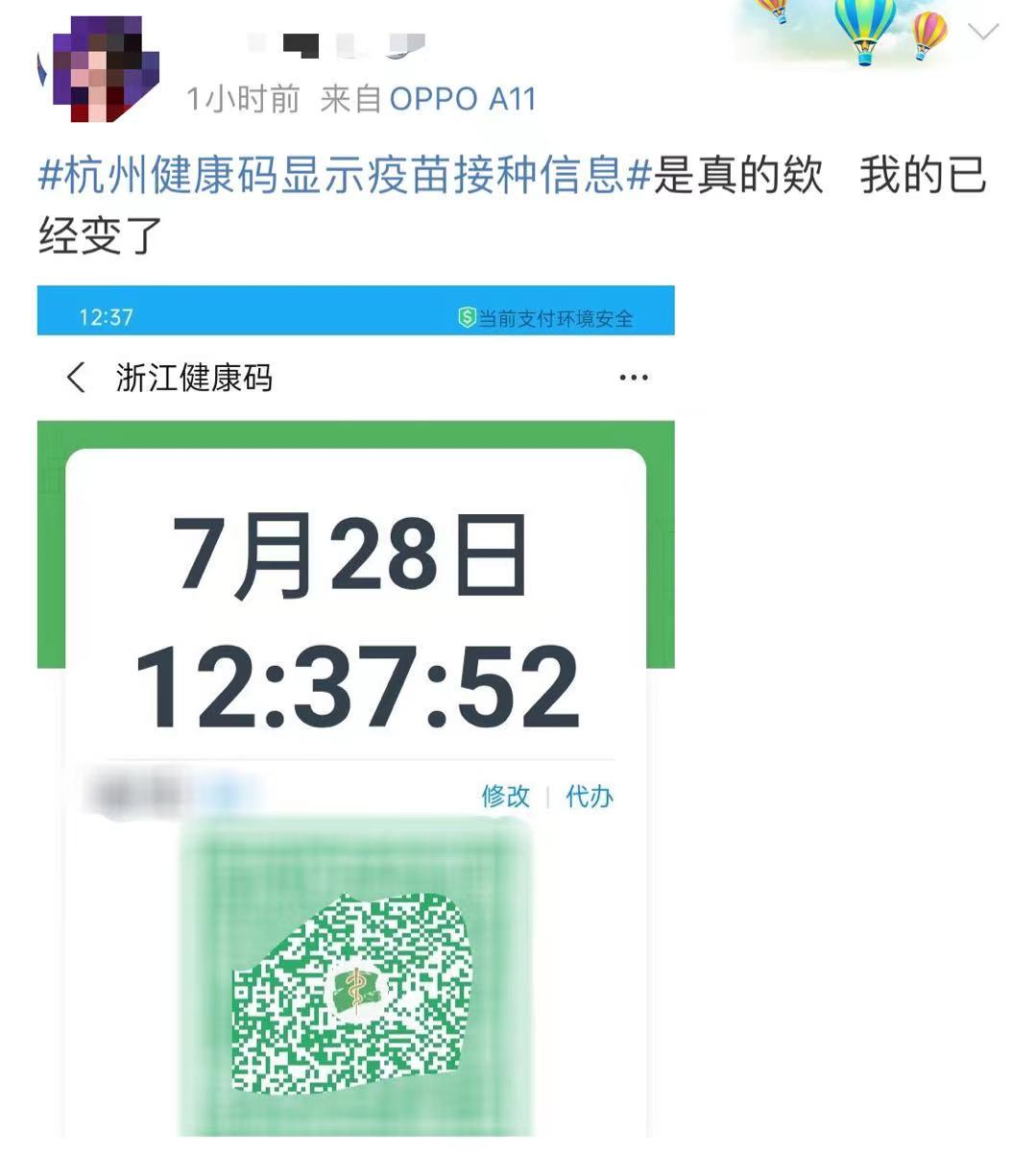 7月28日早,读者吴女士爆料:“我坐地铁时打开健康码,里面多了一项‘已完成新冠疫苗接种’的提醒。”