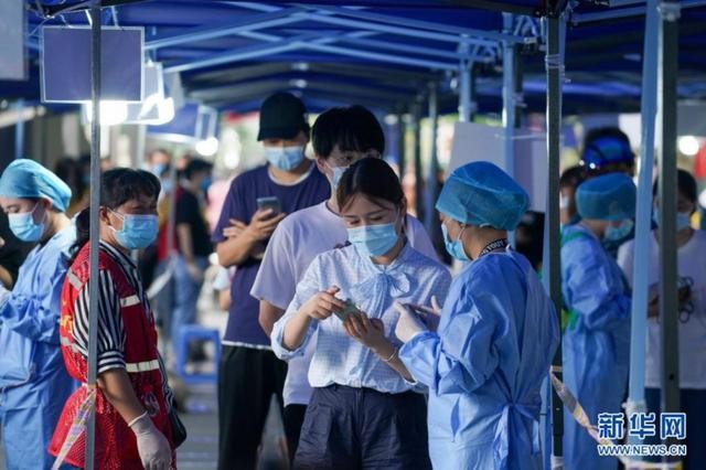 (图说:7月29日,在南京市玄武区新街口街道北门桥社区核酸检测点,工作人员在为市民登记身份信息。 来源:新华社)