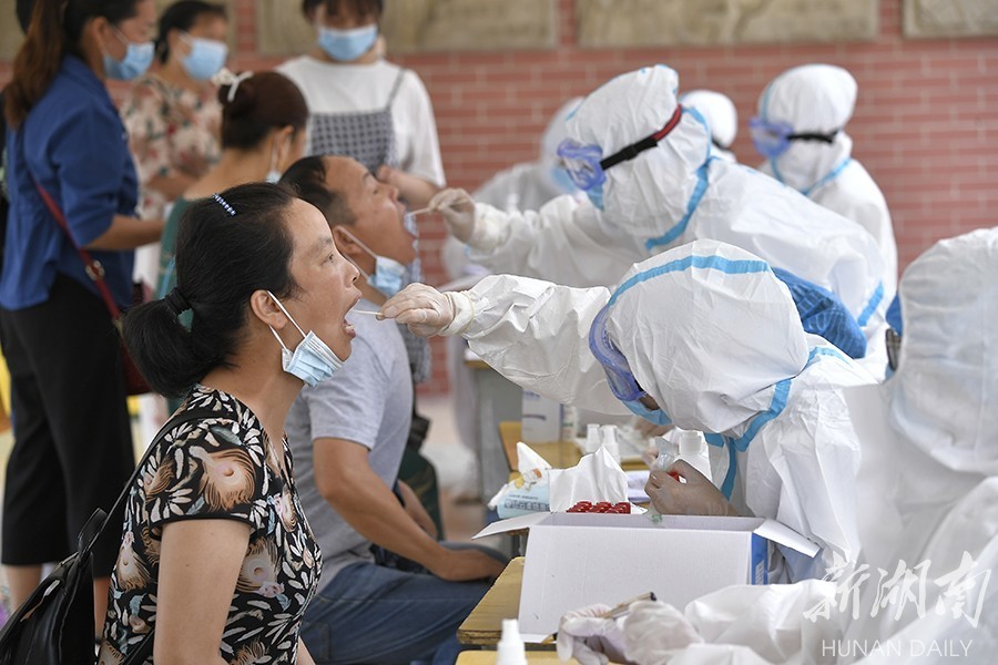 (图说:7月29日,张家界永定区崇实南校核酸检测采样点,市民在有序进行核酸检测。 来源:湖南日报)