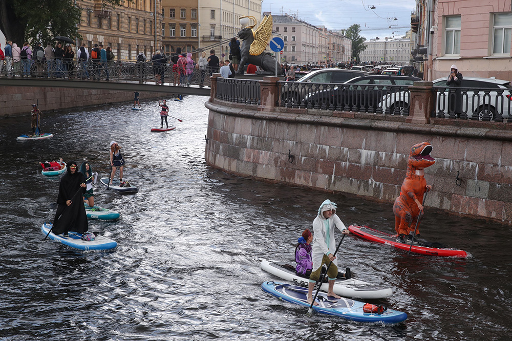 当地时间2021年7月31日,俄罗斯圣彼得堡,当地举行SUP桨板比赛,选手奇装异服参赛。桨板运动,也叫桨板冲浪、直立单桨冲浪。相比其它水上运动,桨板更强调与水的亲密接触。人要直立在桨板上,需要极强的平衡协调能力。源于美国夏威夷的桨板冲浪,近年早已成为了风靡全球的运动。