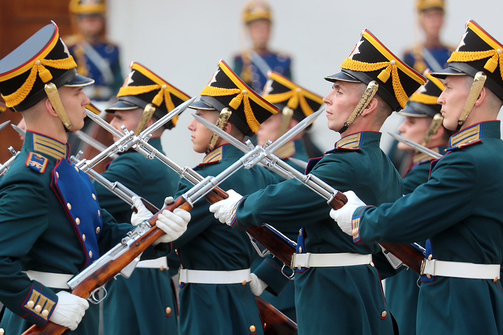 当地时间2021年7月31日,俄罗斯莫斯科,克里姆林宫的索伯纳亚广场,总统团的士兵在进行换岗仪式。这是自2021年7月10日以来举行的首次换岗仪式,当时由于新冠肺炎病例激增而取消了换岗仪式。
