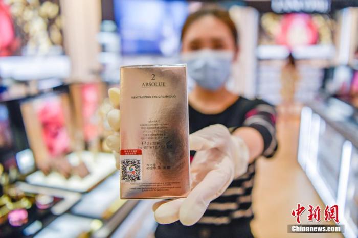 7月31日,海南海口,一免税店的工作人员展示贴有溯源码的免税商品。《海南自由贸易港免税商品溯源管理暂行办法》8月1日开始实施。据介绍,8月1日起,香化、酒水、手机3类离岛免税商品将加贴溯源码销售;12月底,所有离岛免税商品加贴溯源码。如果岛内居民日用消费的“零关税”政策落地,免税日用消费品也要加贴溯源码后销售。中新社记者 骆云飞 摄