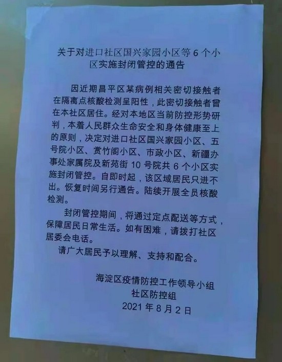 8月2日早上,网传海淀区疫情防控工作领导小组发布了一则《关于对进口社区国兴家园小区等6个小区实施封闭管控的通告》,指出海淀区进口社区国兴家园、五号院小区等多个小区实施封闭管理,“问北京”记者第一时间赶到现场核实情况。