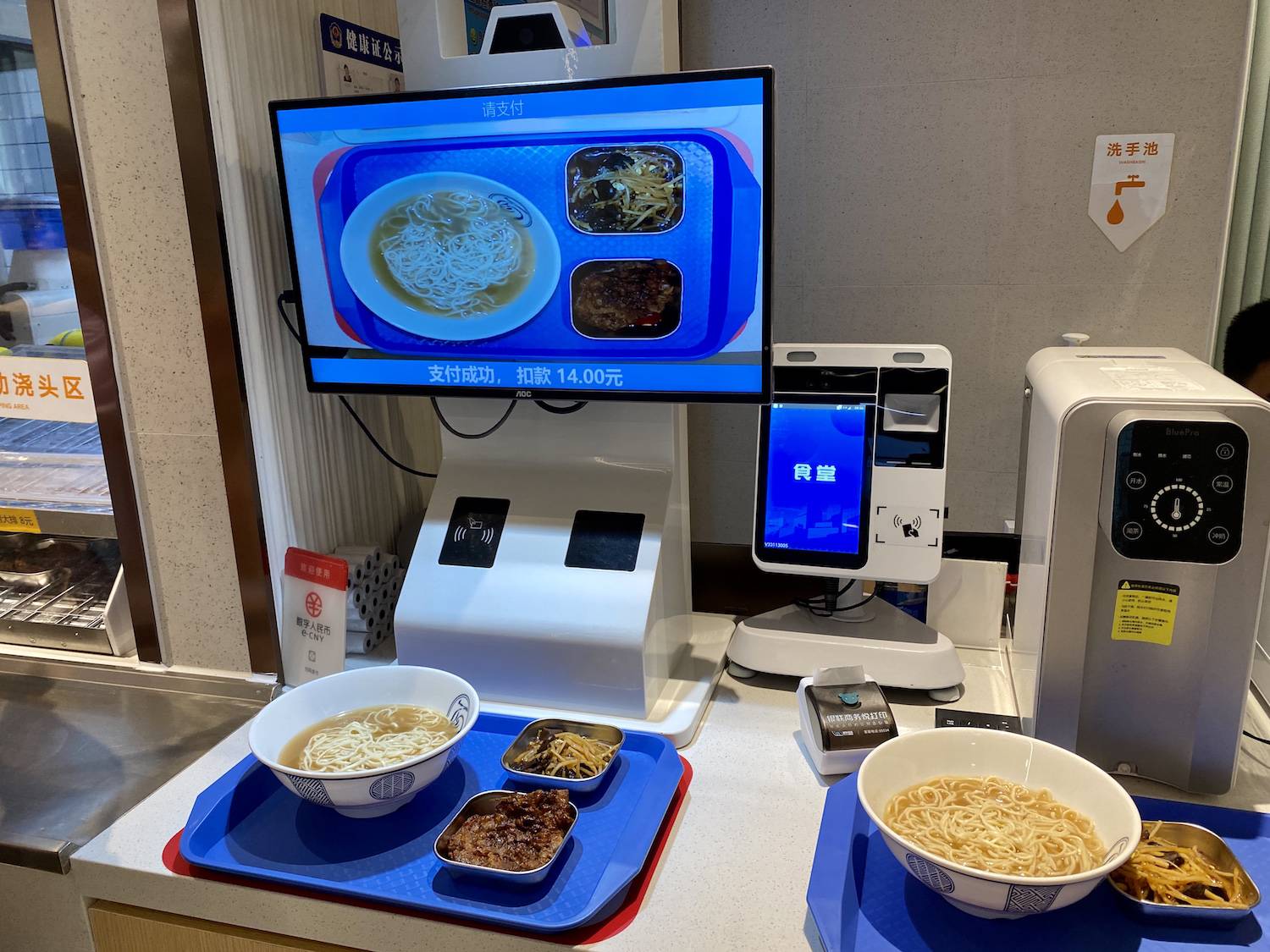 顾客在十余种浇头中进行选择后,便可以通过AI识别智能结算台进行自助支付。菜品识别、菜品价格计算在相关区域内自动进行,除了微信、支付宝、刷卡扫脸等方式,还能通过老年卡进行支付,在一定程度上解决了老年人的支付难题,力求便民省力。