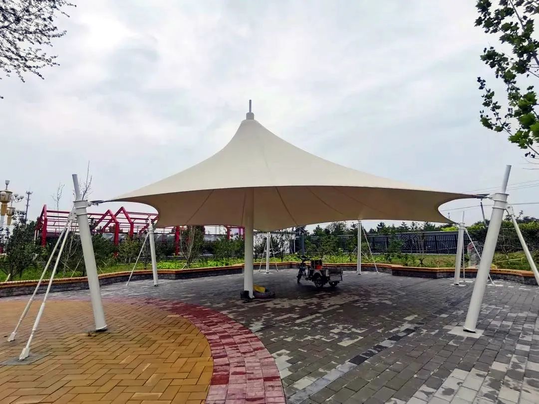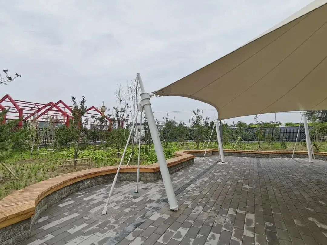 最后到达休闲活动广场,一个白色伞状的廊架矗立中央,人文与自然相互交融,极富艺术韵味。口袋公园连着城区品质,通着社会民生,装着老人的安逸,载着孩子的欢乐。