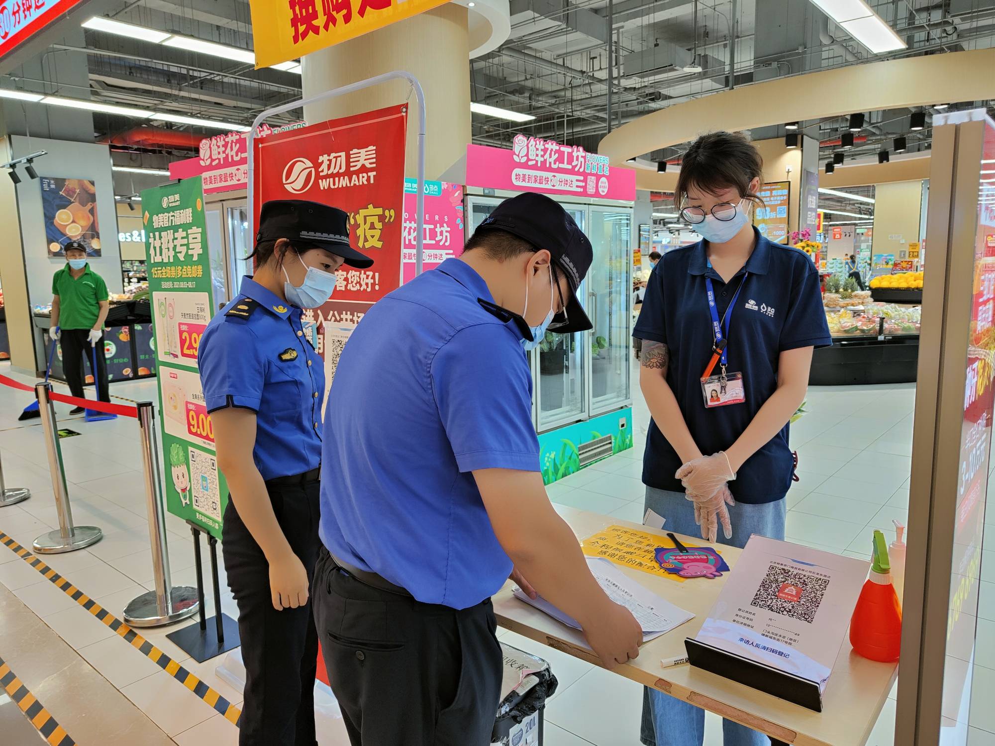 记者跟随执法人员来到北京长安天街商场,经检查发现,商场已按照要求落实防疫措施,市民不仅进门时要进行测温扫码,前往地下一层的超市还要进行二次测温扫码。此外,商场还安排了专人定时对公共区域进行消杀,让市民放心购物。