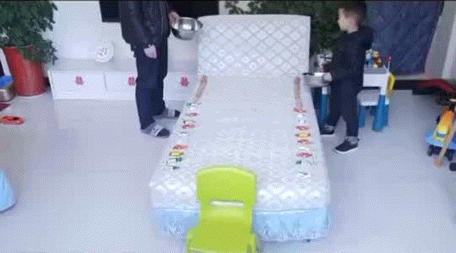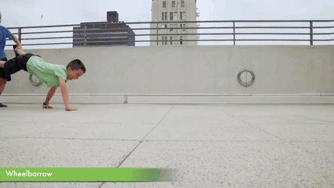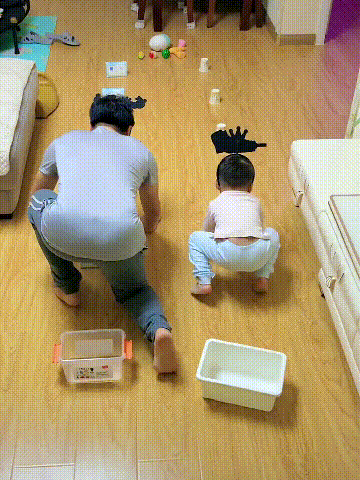 找一个前方畅通无阻的室内通道、宽敞的客厅或者阳台,孩子先俯身用双手掌撑地板,爸爸站在孩子双腿中间,并用双手握住孩子脚腕把孩子双腿抬起(孩子先尝试手掌支撑稳定再行走)。此时孩子靠双手往前行走,锻炼孩子的臂力和亲子的默契程度。