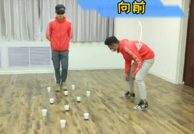 将障碍物分几排放在地上,前后排错位摆开,孩子根据家长输送的口令穿过障碍物。