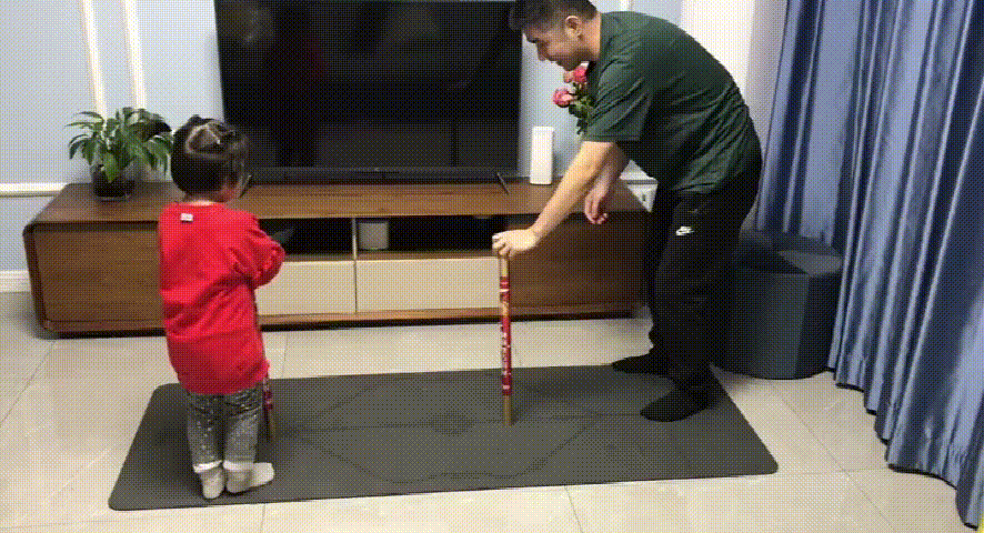单手立直长棍,根据口令,家长和孩子同时松开手中的长棍,去接对方手中的长棍,接住长棍使其保持直立。