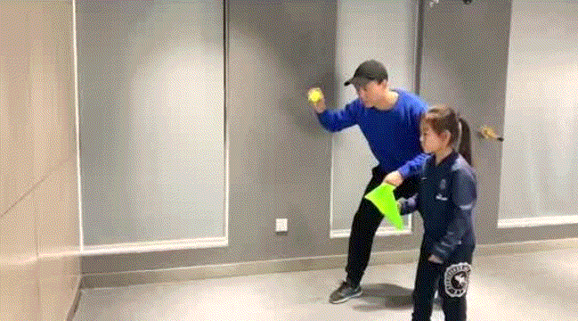 家长将球抛执向地面,使球从墙面弹跳回来,孩子单手拿容器接球,抛接6次为一组,每次8组。