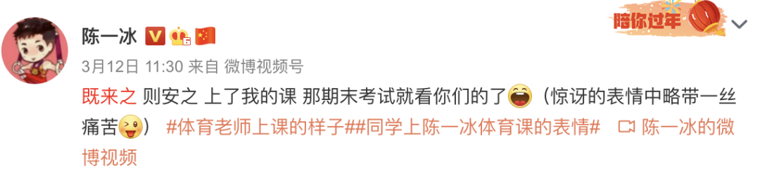 据北师大官微讲述:与他比赛中坚毅、霸气的神情不同,陈一冰在课堂上温柔可亲、细致入微,如同邻家的小哥哥。课上,陈一冰实现每个动作都是轻松自如的,而学生们常常需要咬牙坚持。