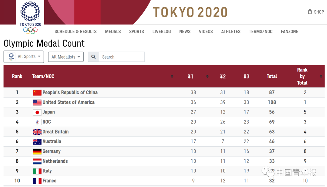 截至北京时间今早8点,国际奥委会官网的奖牌榜,中国位列第一