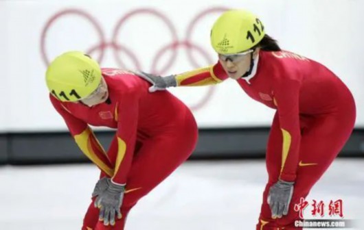 资料图:都灵时间2006年2月25日晚,中国选手王濛、杨扬在短道速滑女子1000米比赛中夺得银牌、铜牌。中新社发 武仲林 摄
