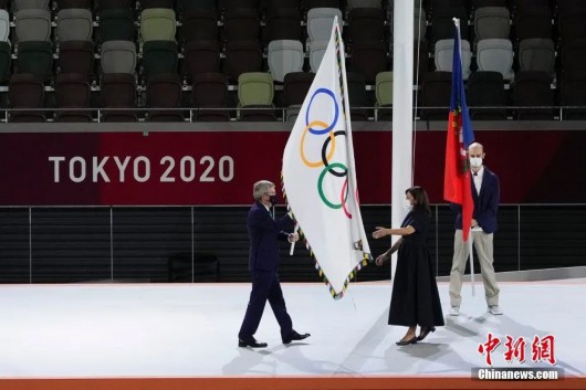 巴黎市长从国际奥委会主席巴赫手中接过会旗,