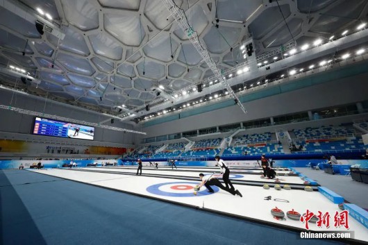 资料图:“水立方”到“冰立方”的华丽转身。2021年4月1日,“相约北京”冰上测试活动进行冰壶比赛。中新社记者 韩海丹 摄
