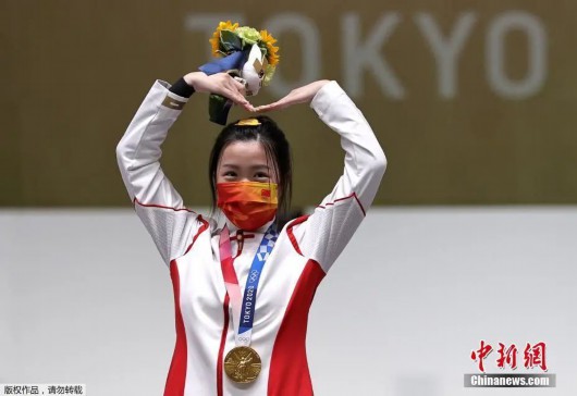 7月24日,杨倩取得东京奥运会女子10米气步枪金牌后,在颁奖仪式上比爱心。