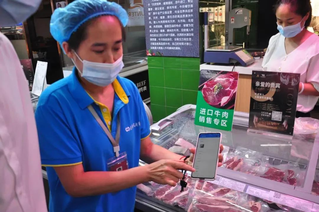 新东风购物广场超市,工作人员展示冷链追溯信息