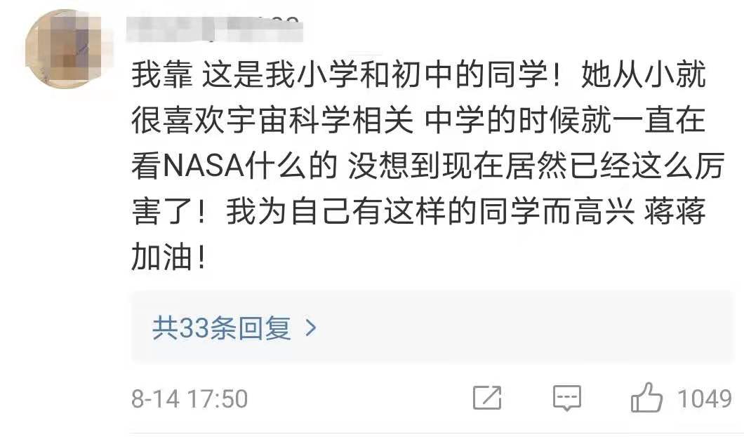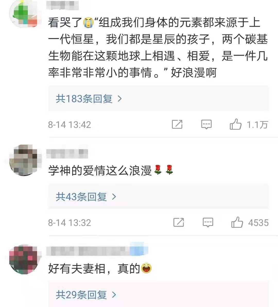 据悉,他们相识于高中天文社团,日常约会是在文昌看火箭发射,在天荒坪和盱眙看流星,在网上找超新星。