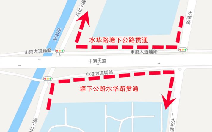水华路车辆可通过申港大道新建辅道,进入塘下公路,反方向同理。