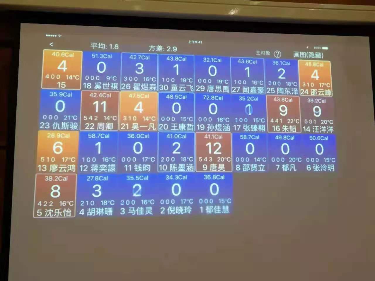 细看在泳池里上课的学生,你会发现,在他们的手腕上,大多佩戴着名为“健康豆”的手环状运动传感器。泳池前方的屏幕上,一个个整齐排列的方格,有规律地变换着颜色,蓝的、紫的、黄的……不同的方格上,除了有不同学生的名字,还有心率、体温、运动值等实时更新的数据指标,根据运动强度和运动密度的加权求和,复杂的运动轨迹会被简化为一维的运动值——在0到18的范围内波动,呈现在每个方格的正中央。