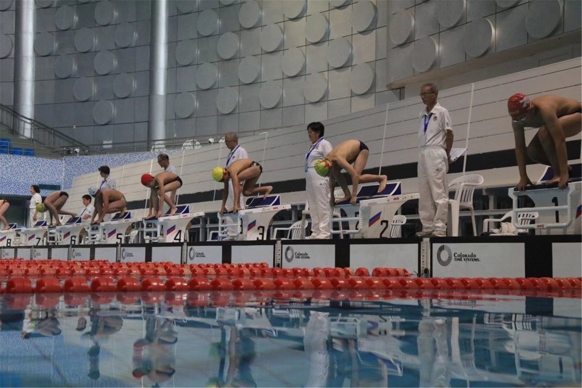 泳池内,共有六根泳道,中间两根泳道是给会两种泳姿及以上的学生准备的“提高班”,两边最外侧留给基础较弱的学生,其余两根道则针对已掌握一种泳姿的学生开设基础班。每根道都配备专门的教练,根据学生不同水平进行“因材施教”。