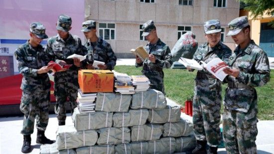 “致敬边关阳光公益行动”将大批经典图书赠送阿拉马力边防连官兵。林洁川 摄