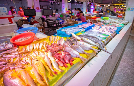 走进市场,活蹦乱跳的鱼虾,个头硕大的螃蟹随处可见。