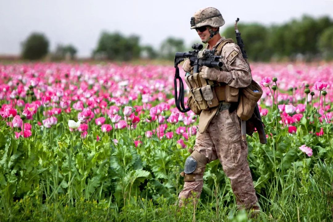 ▲2011年4月,一名美国海军陆战队士兵在阿富汗赫尔曼德省的一片罂粟田中巡逻。