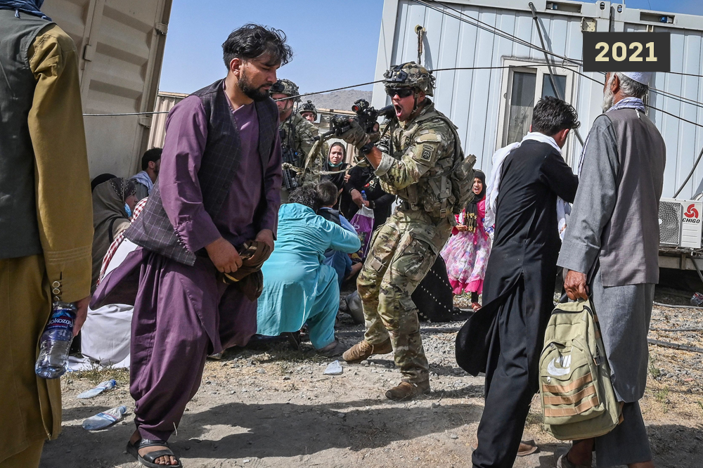 ▲2021年,“从实力地位出发”:在喀布尔卡尔扎伊国际机场,一名美军士兵咆哮着端起枪指向手无寸铁的阿富汗民众。