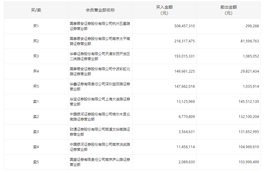 龙虎榜数据显示,国泰君安杭州五星路买入5.08亿元,国泰君安南京太平南路买入2.18亿元并卖出8160万元。