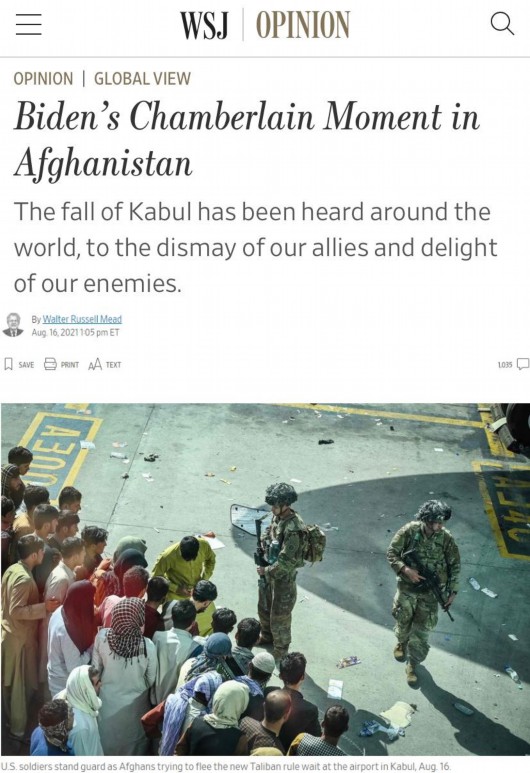 美国哈德逊研究所研究员、纽约巴德学院教授华尔特·拉索尔·米德日前在《华尔街日报》网站发表题为《拜登在阿富汗的张伯伦时刻》的文章,认为拜登政府正面临严重的外交政策危机。与此同时,美国的国际声望也遭到沉重打击