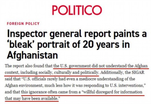 美国阿富汗重建行动特别督察长办公室(SIGAR)日前发布报告说,由于缺乏对阿富汗政治与文化的了解,历届美国政府的政策都故意无视阿富汗当地的实际情况以及阿富汗人民的意愿、试图在阿富汗强行推行严重脱离现实的发展模式。而这样的政策从一开始就注定要失败。